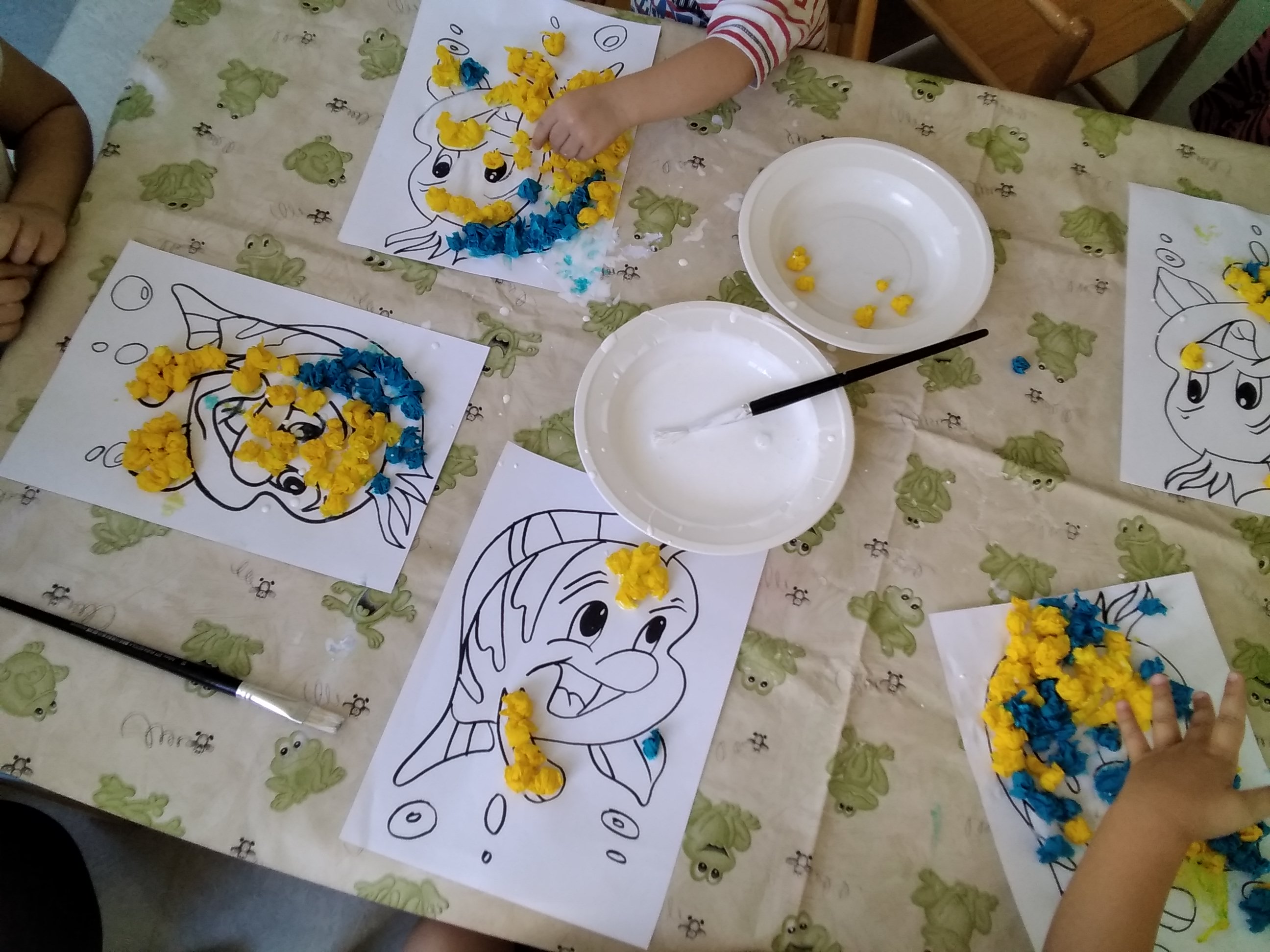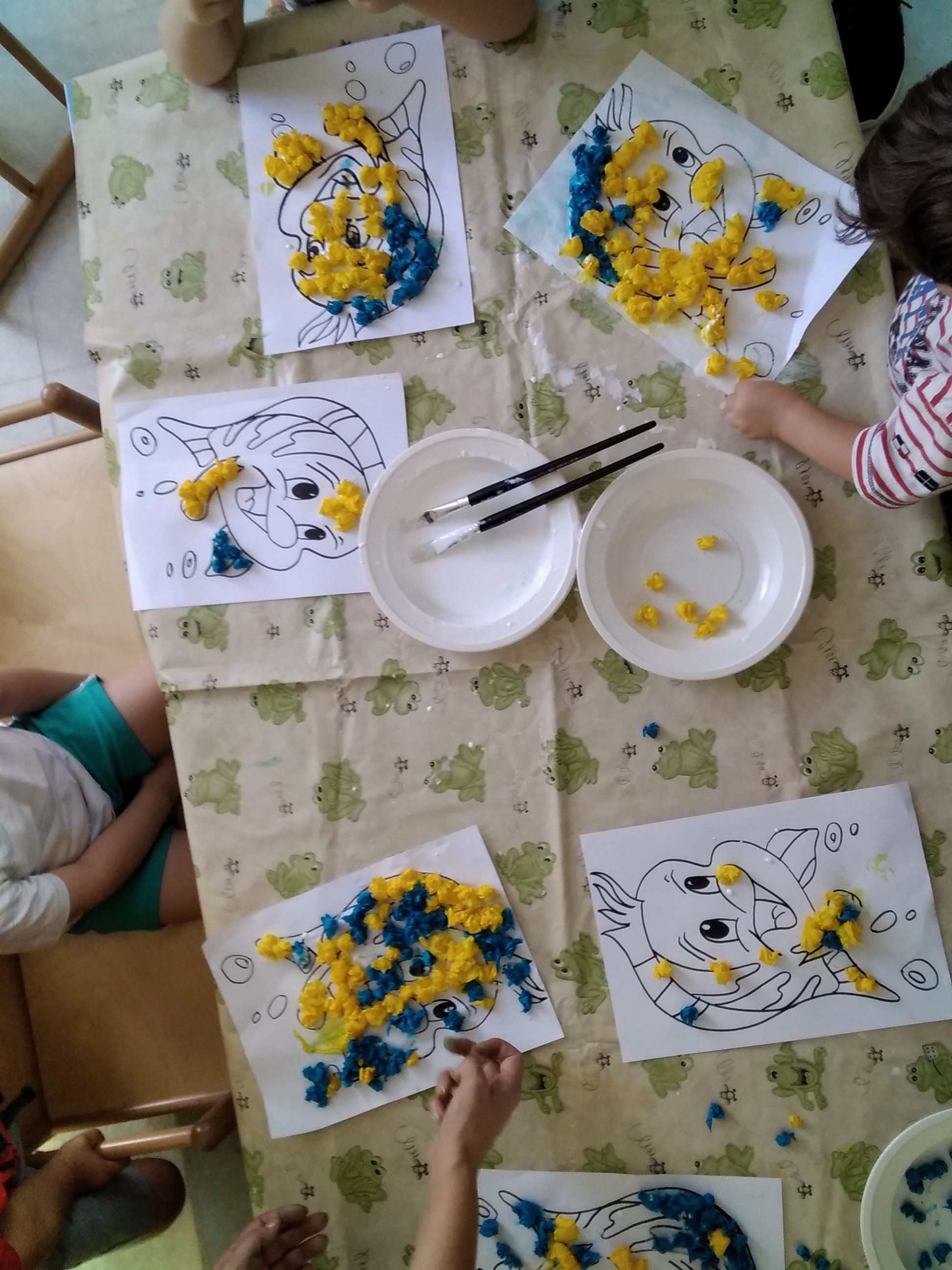 Un gruppo ha conosciuto il pesciolino Flounder, lo ha colorato con le palline di carta crespa usando la colla ed i pennelli.