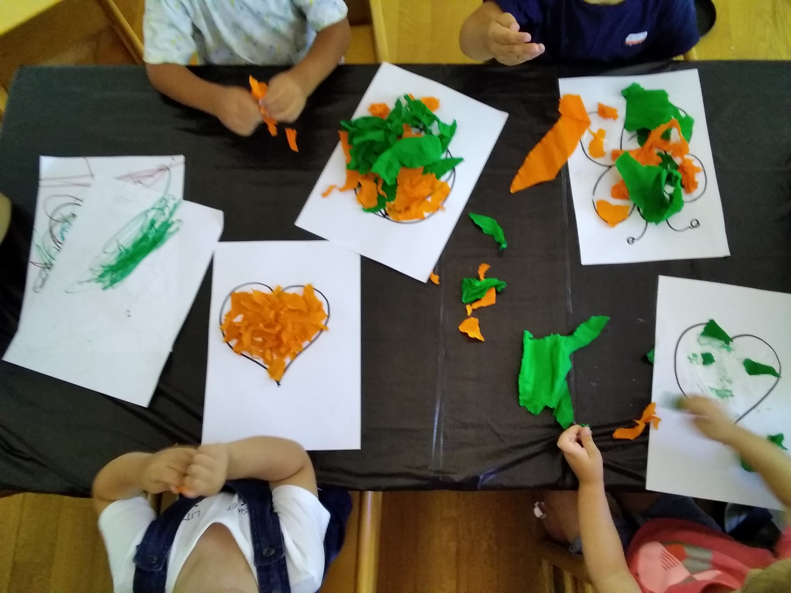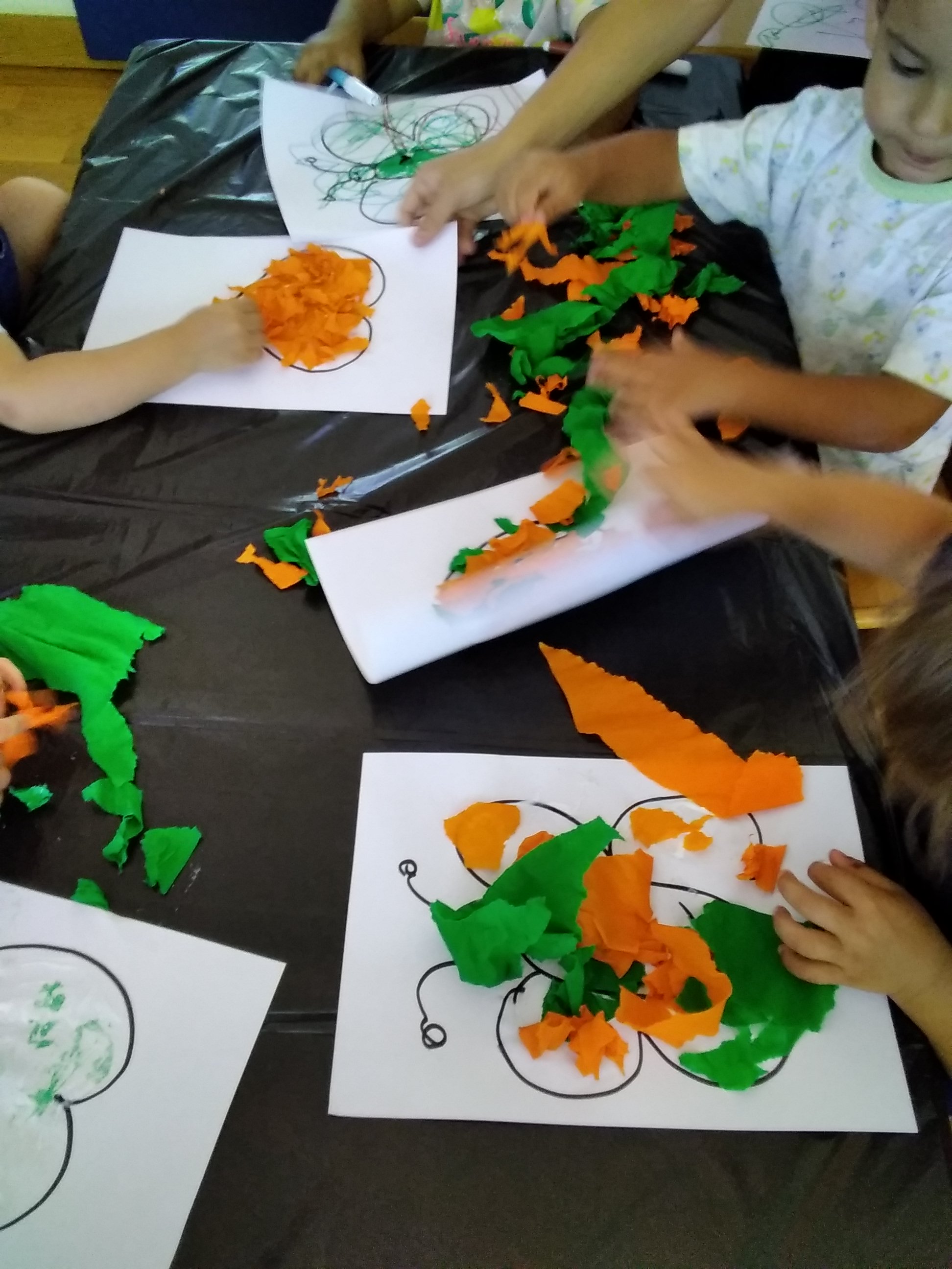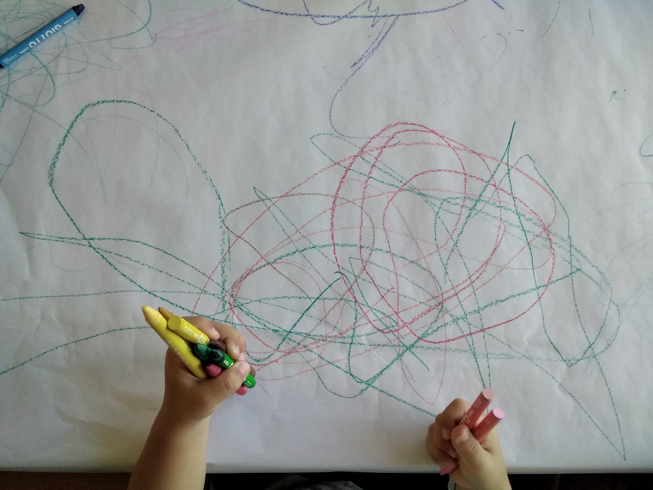 Strappaincolla, espressione grafica con pastelli a cera, movimento all’aperto.