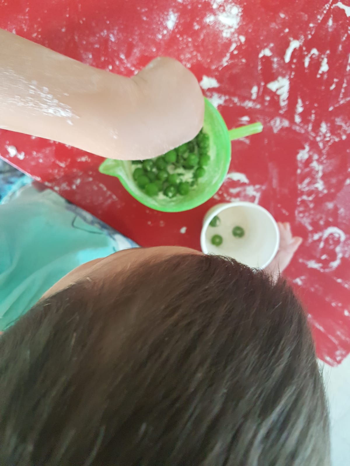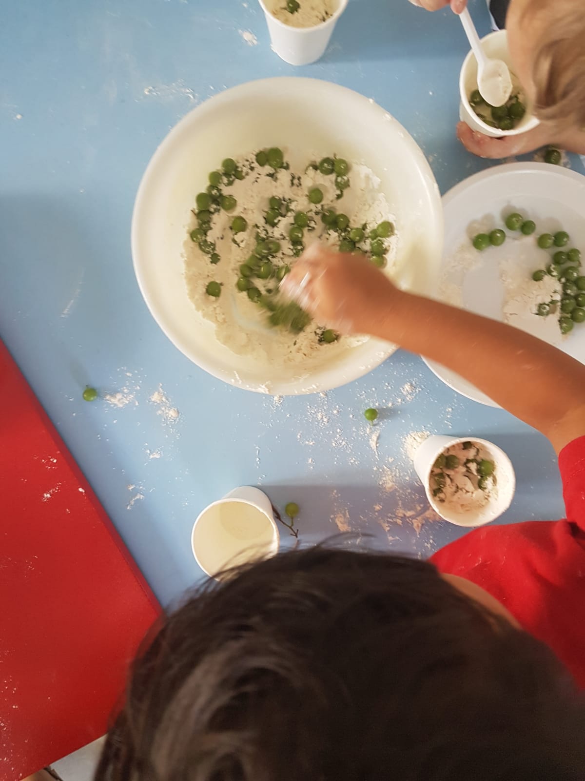 I bimbi blu fanno i travasi. Quest’attività ci è piaciuta tantissimo! Eravamo tutti molto concentati. Abbiamo usato farina pasta e l’uva del giardino.