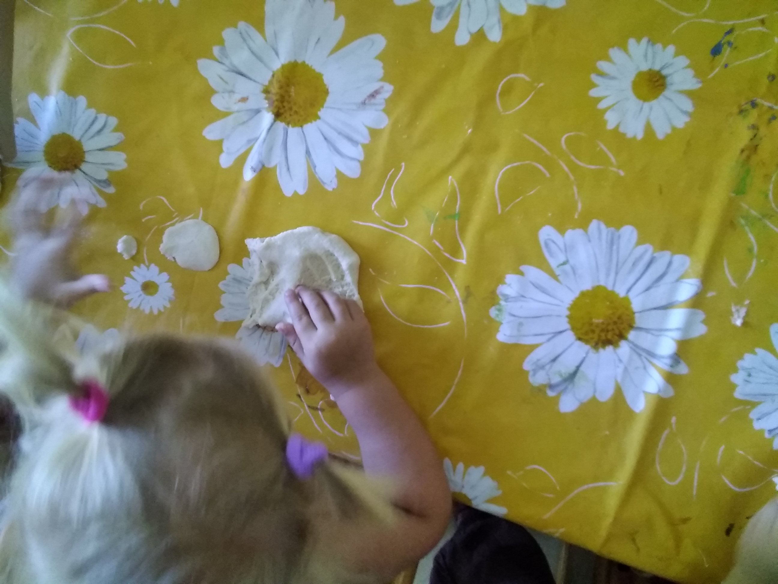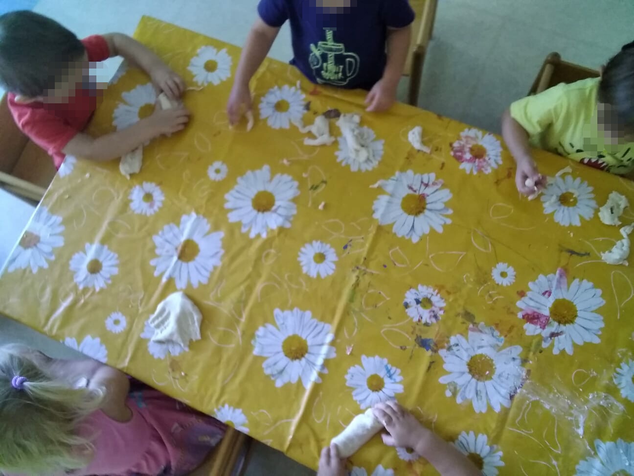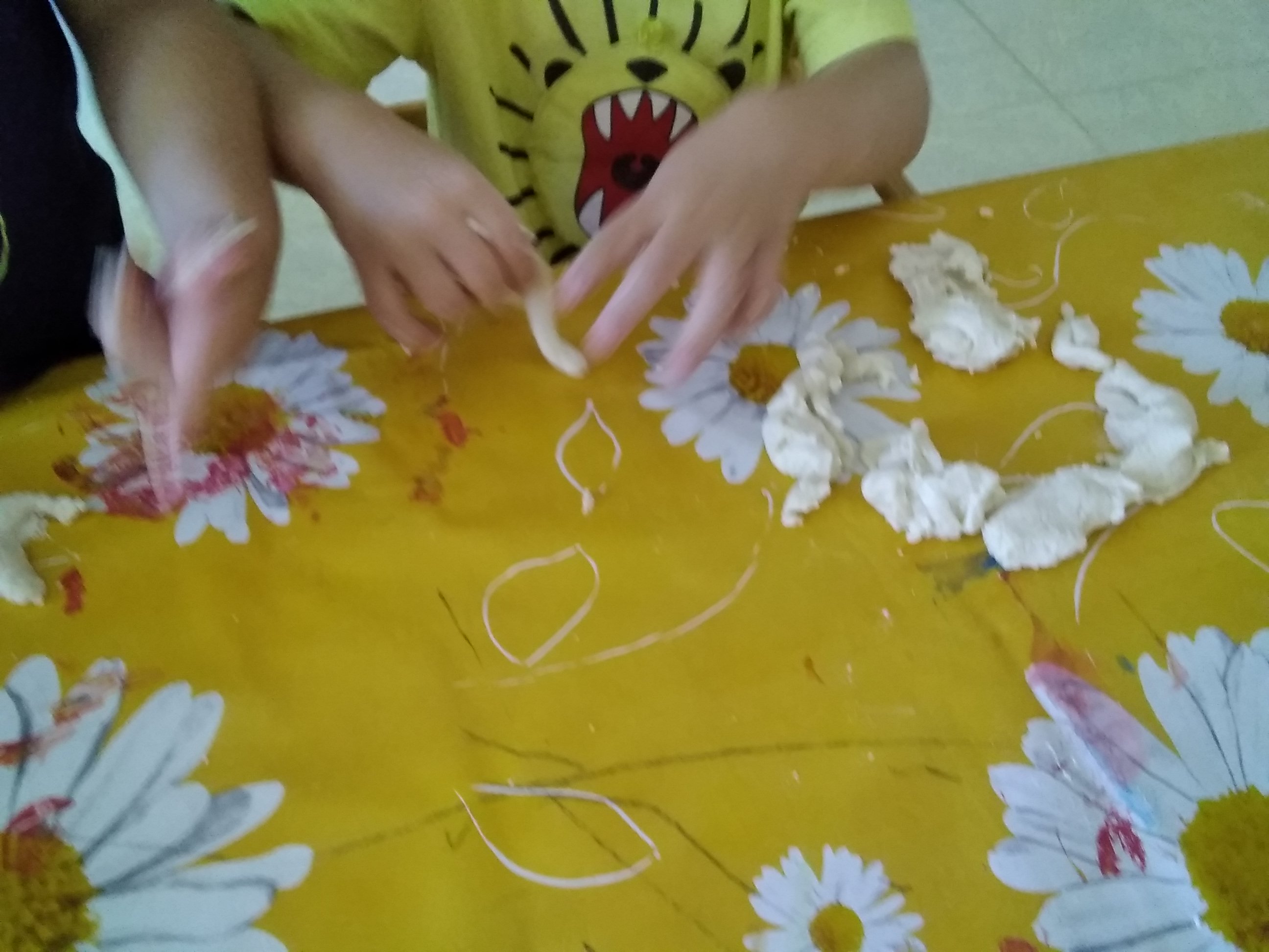 Oggi il Gruppo Giallo ha fatto la pasta di sale. Ecco qui i bimbi che hanno impastato la pasta di sale per creare tante cose diverse con le formine. Che divertimento!