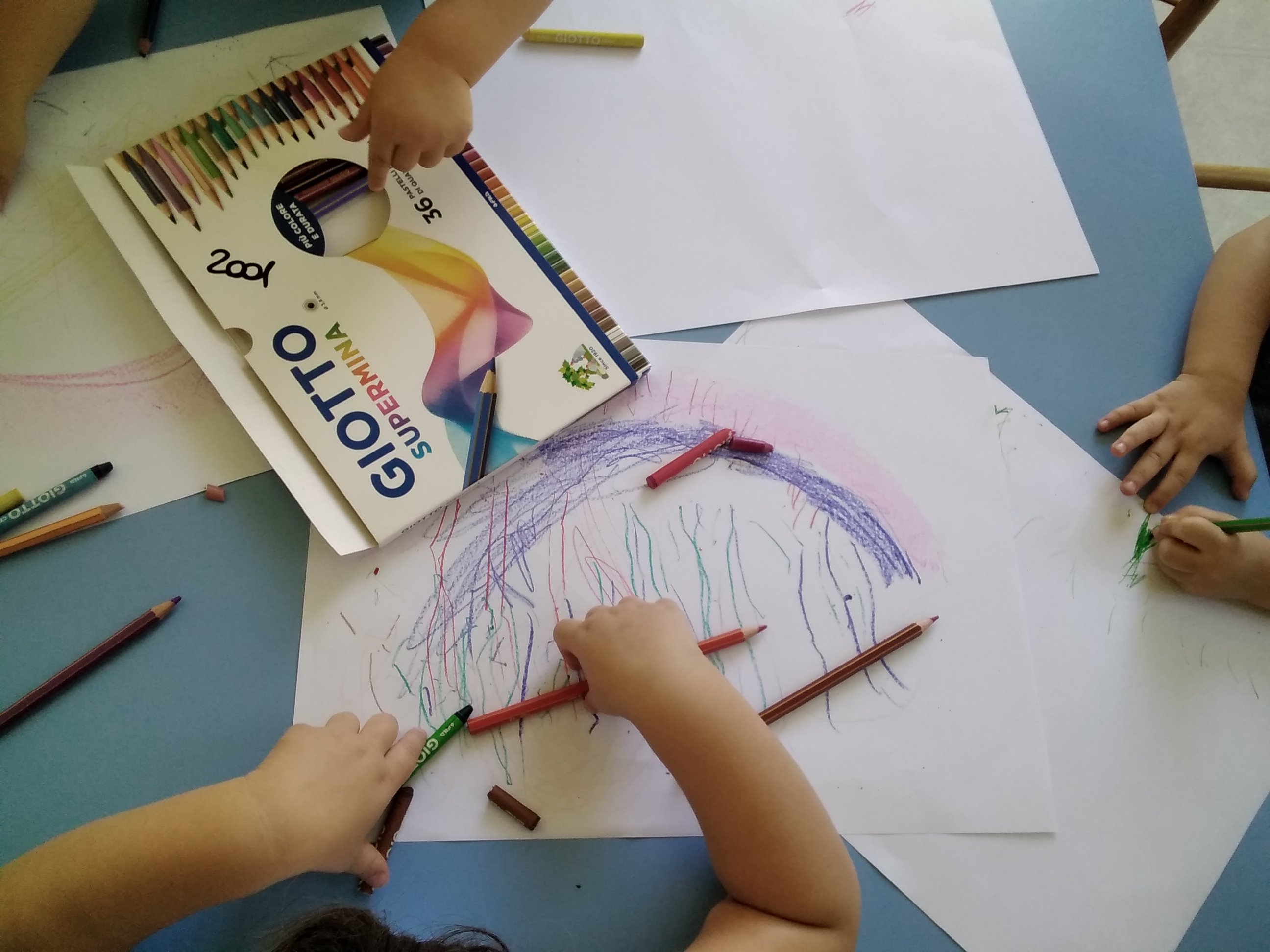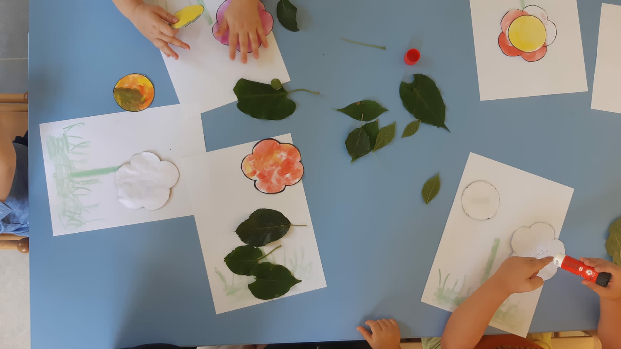 I fiori e le foglie. Il gruppo dei verdi ha completato i lavoretti di ieri. I bimbi hanno incollato i fiori che avevano dipinto ieri con gli acquerelli ed hanno aggiunto le foglie raccolte in giardino. Poi hanno fatto un po’ di disegno libero con le cerette