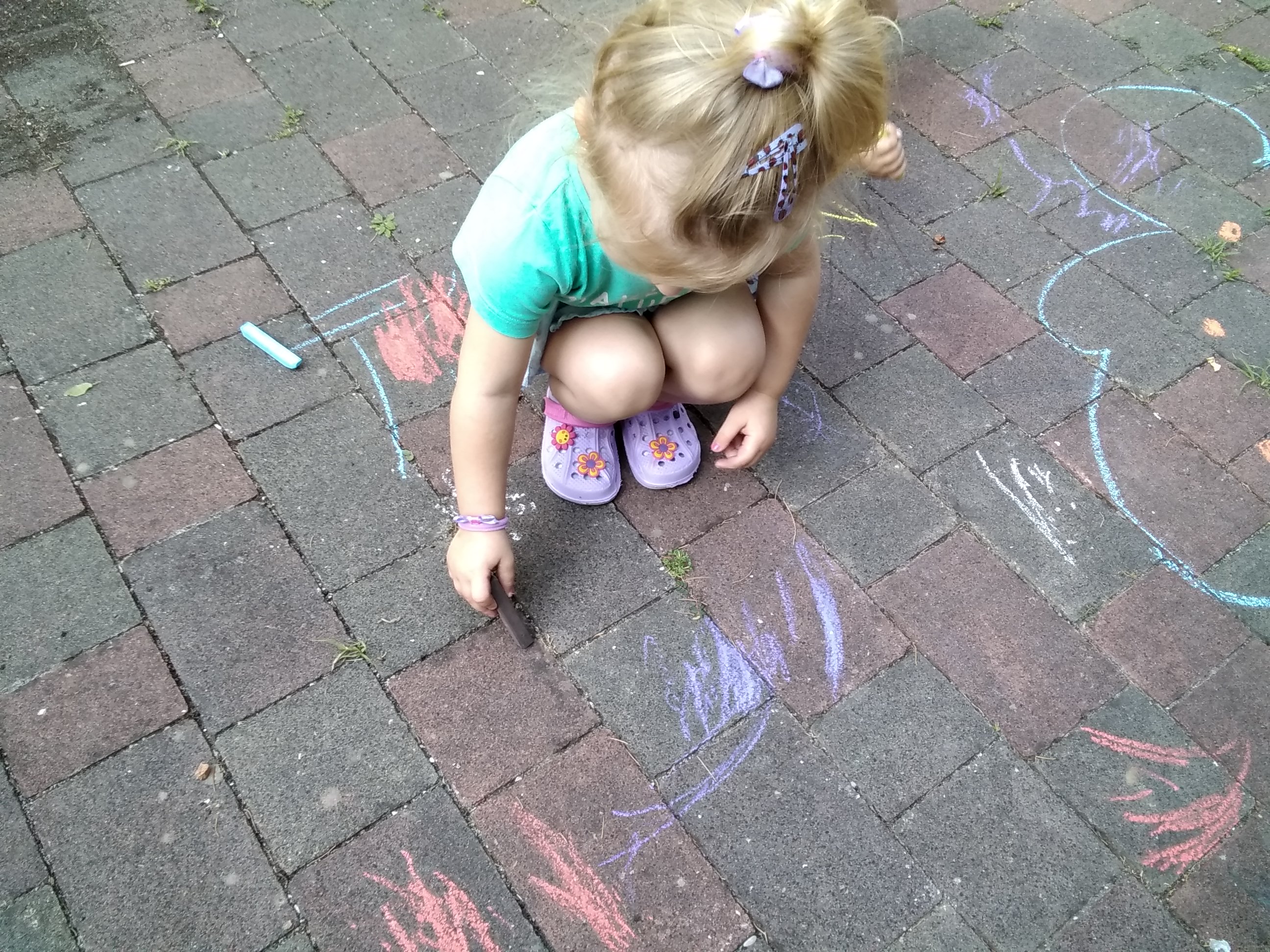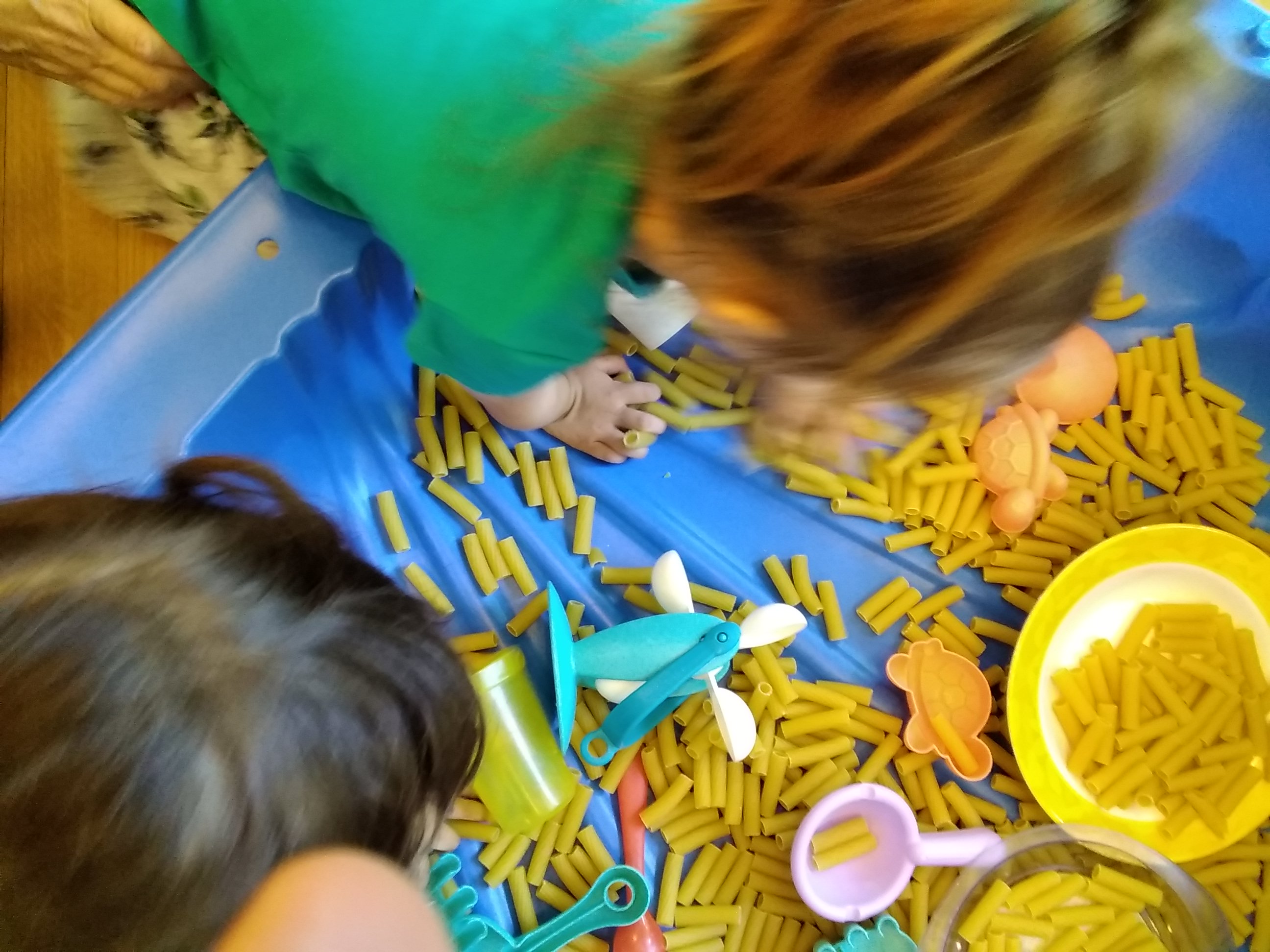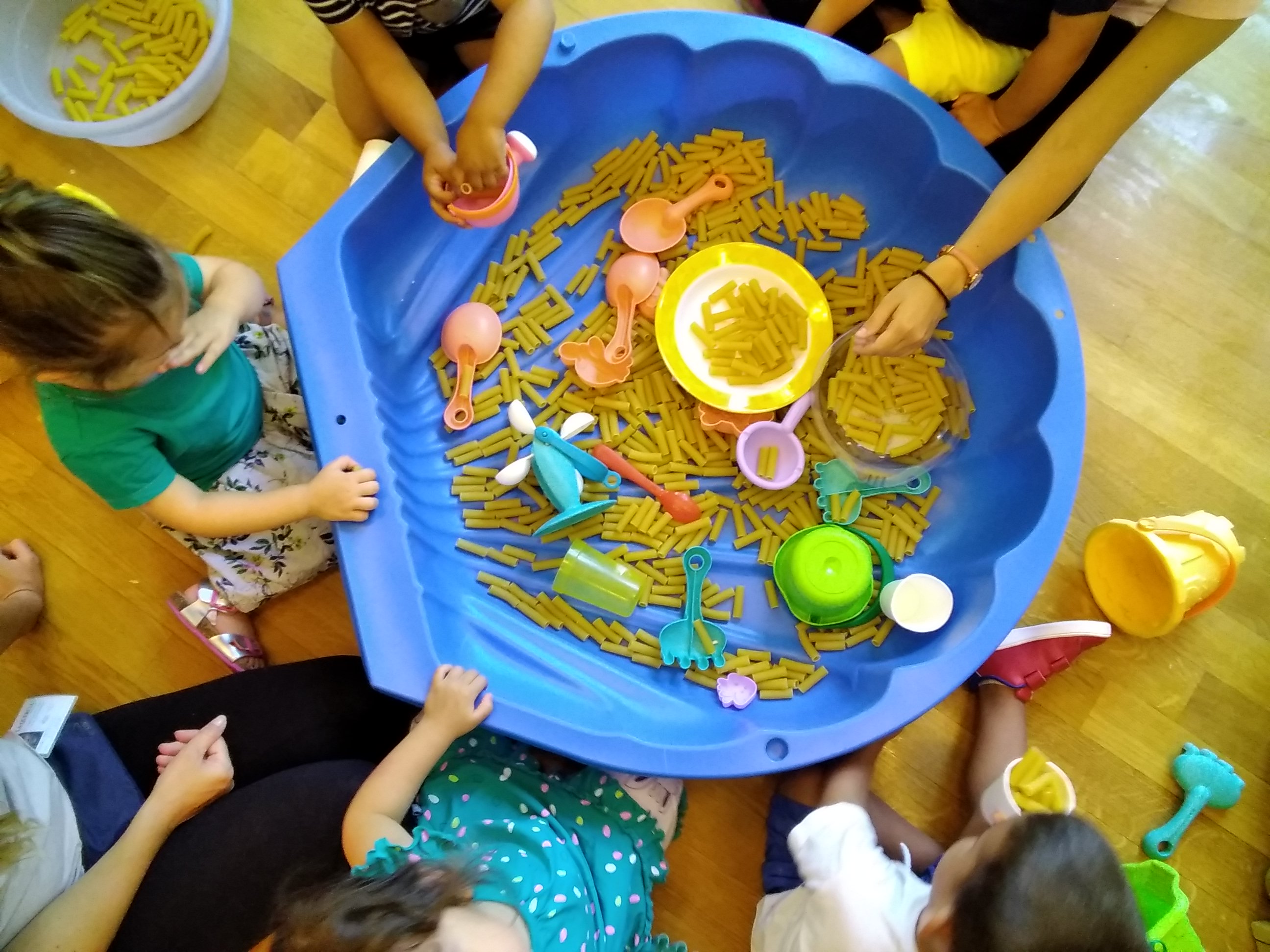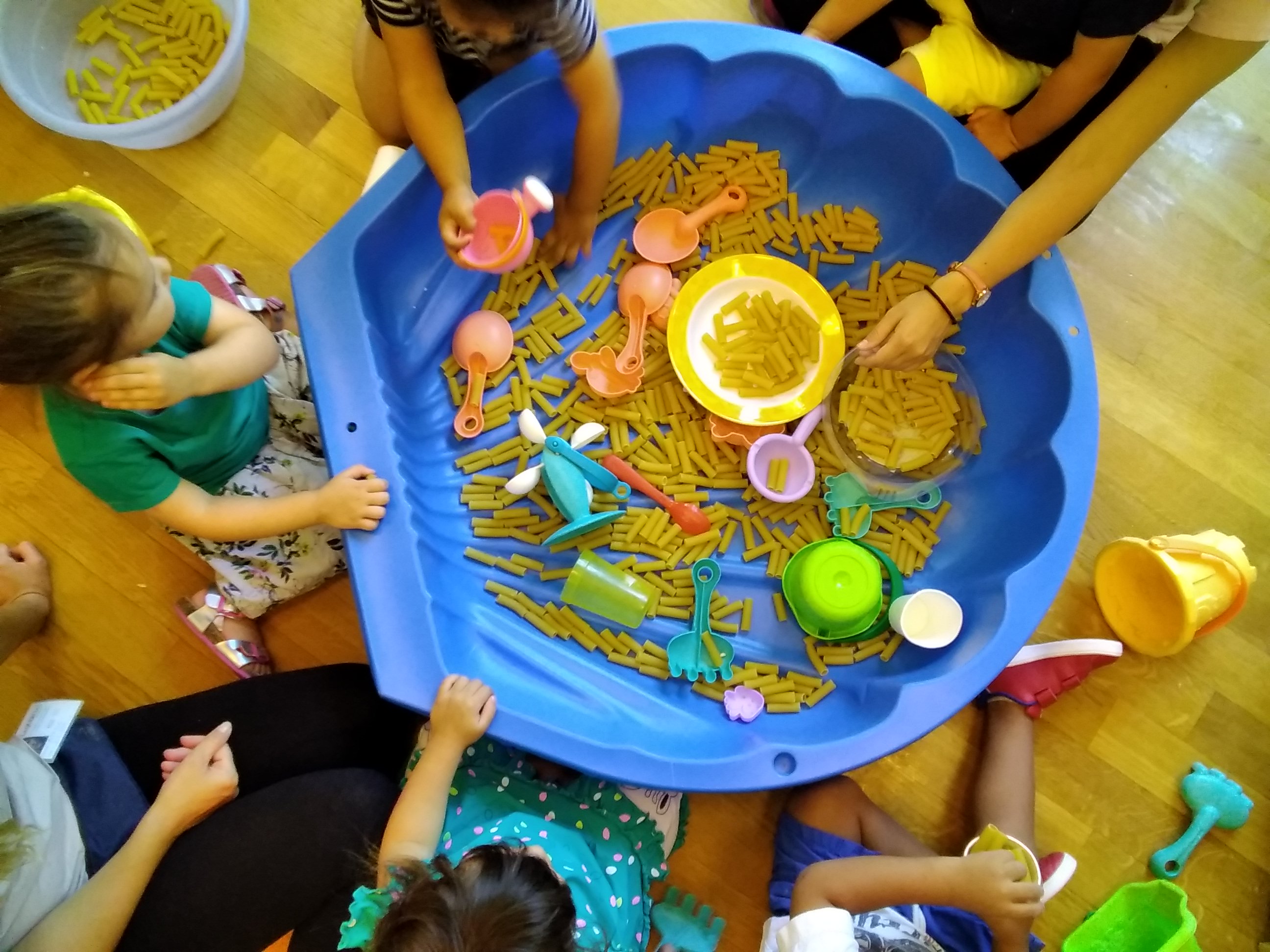 Noi del Verdenido siamo sempre in movimento, oggi abbiamo ballato, colorato con i gessi colorati in giardino e ci siamo divertiti a fare i travasi con la pasta.