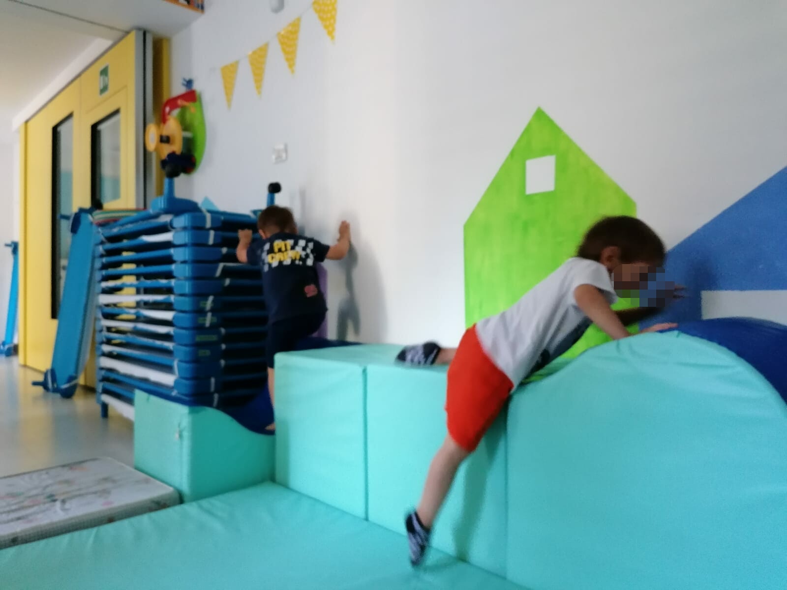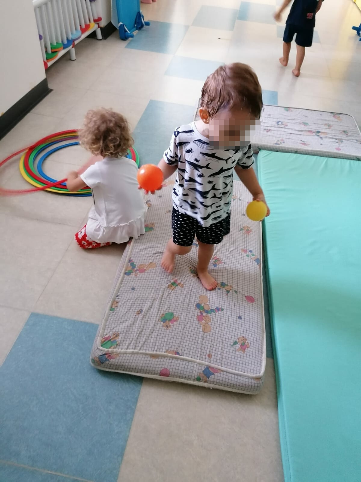 Oggi siamo piccoli canguri! Il gruppo dei gialli ha usato la propria stanza per fare attività motoria: che bello fare i salti e le corse sui materassi. Ci sono anche le palle colorate da lanciare e i cerchi da fare girare.