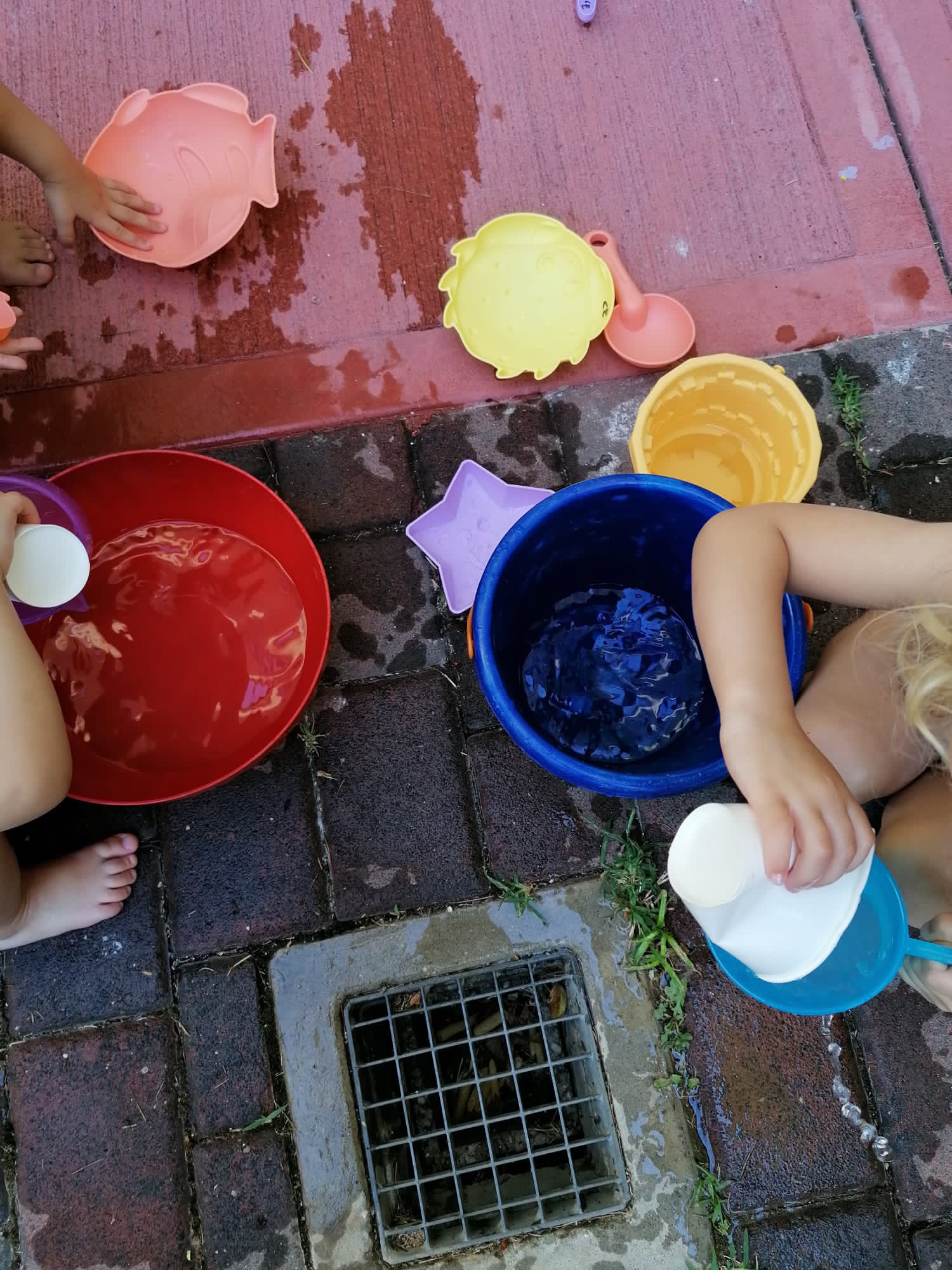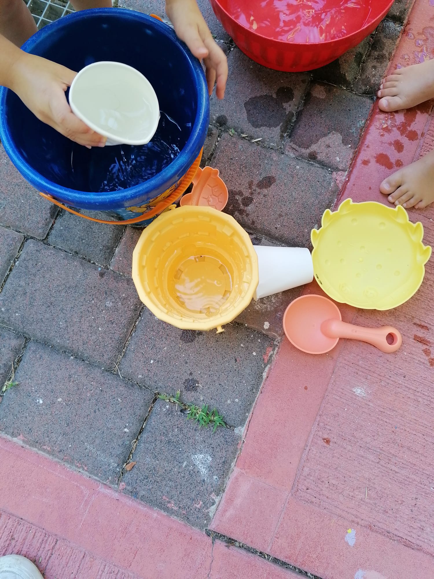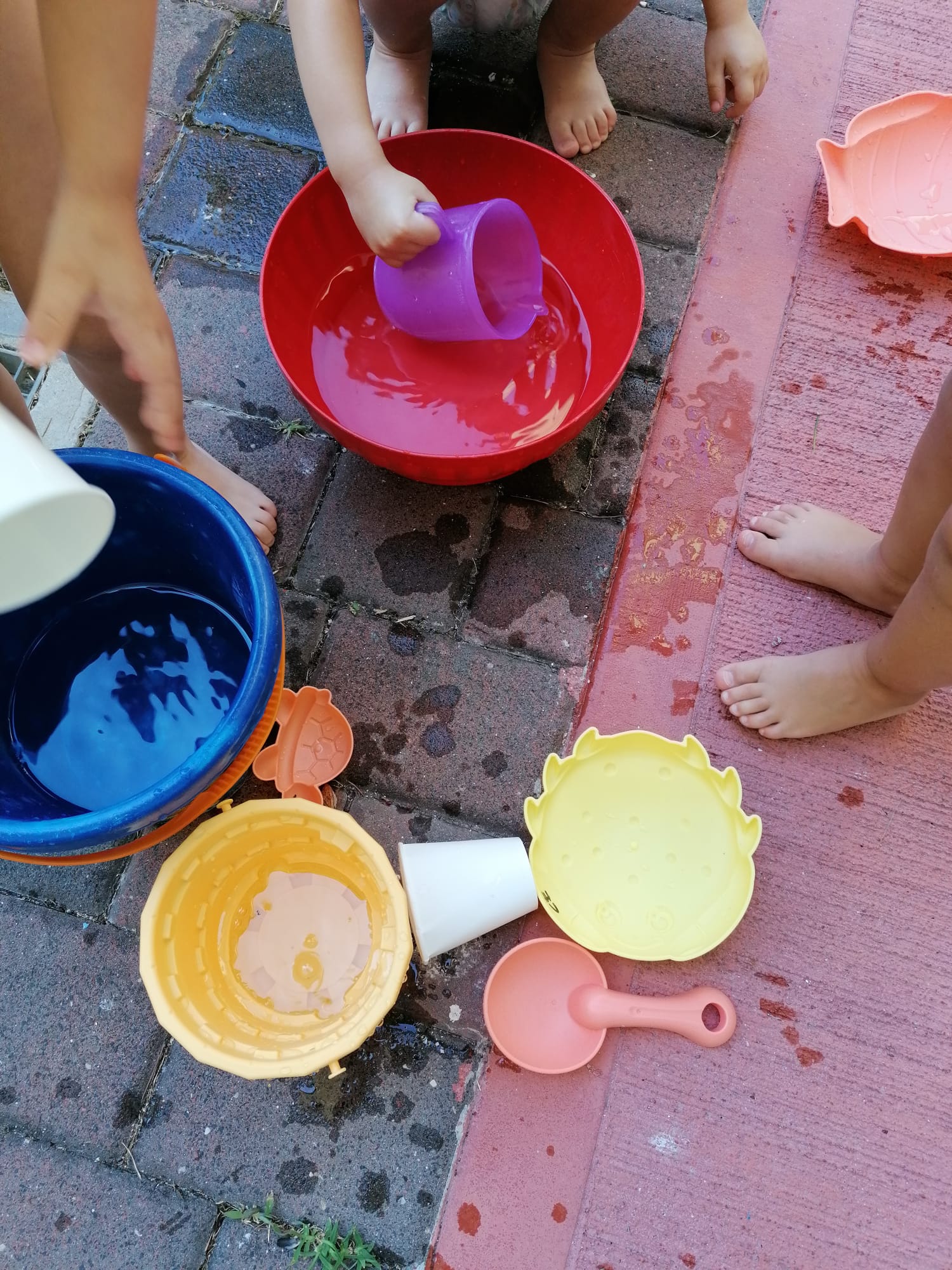 SPLASH! Il gruppo dei gialli oggi si è dedicato all’attività dei travasi, ma perché accontentarsi di farina e pasta… quando si può usare l’acqua! È davvero rinfrescante questo gioco.